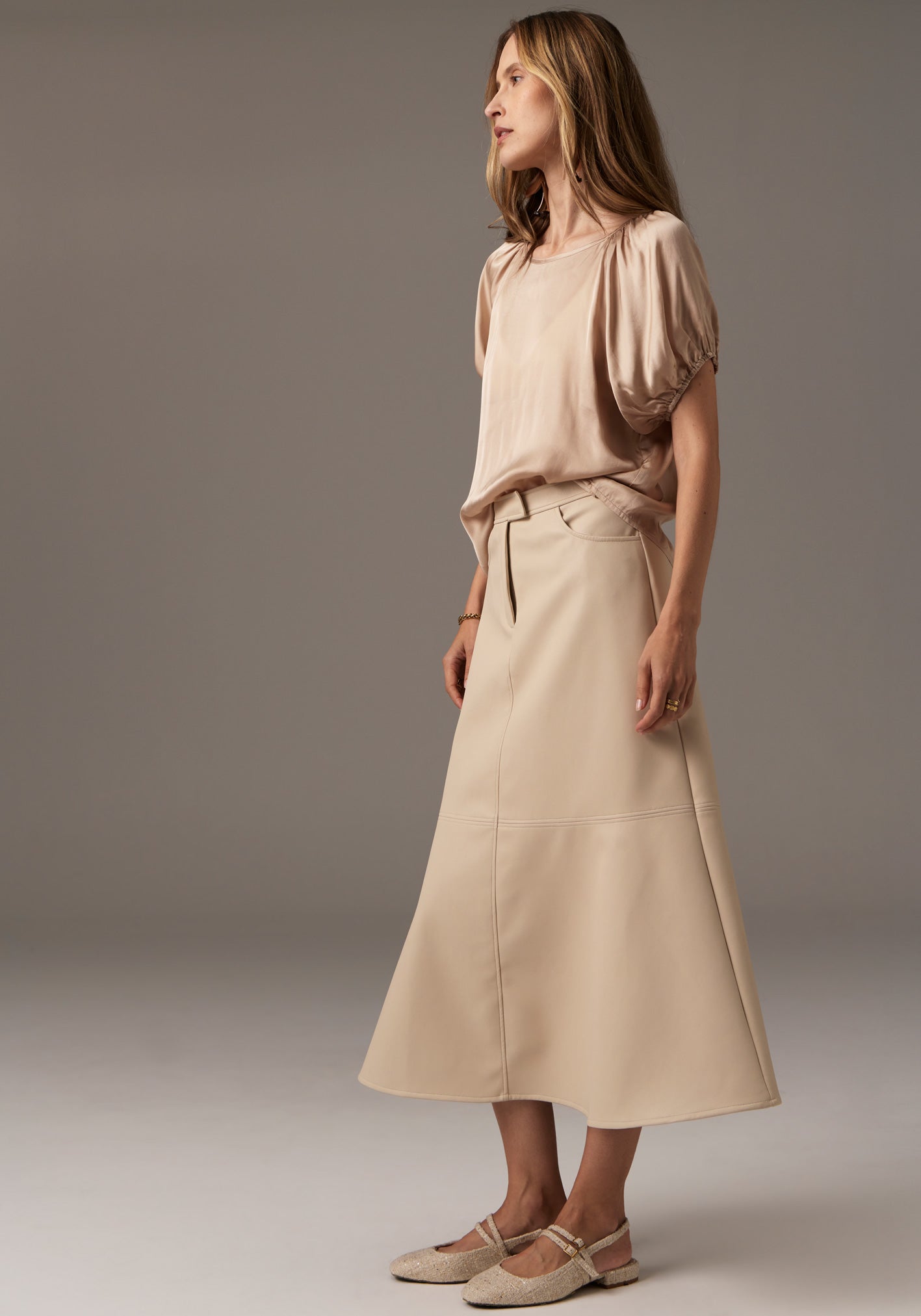 -Flares out into an a-line shape from above the knee.