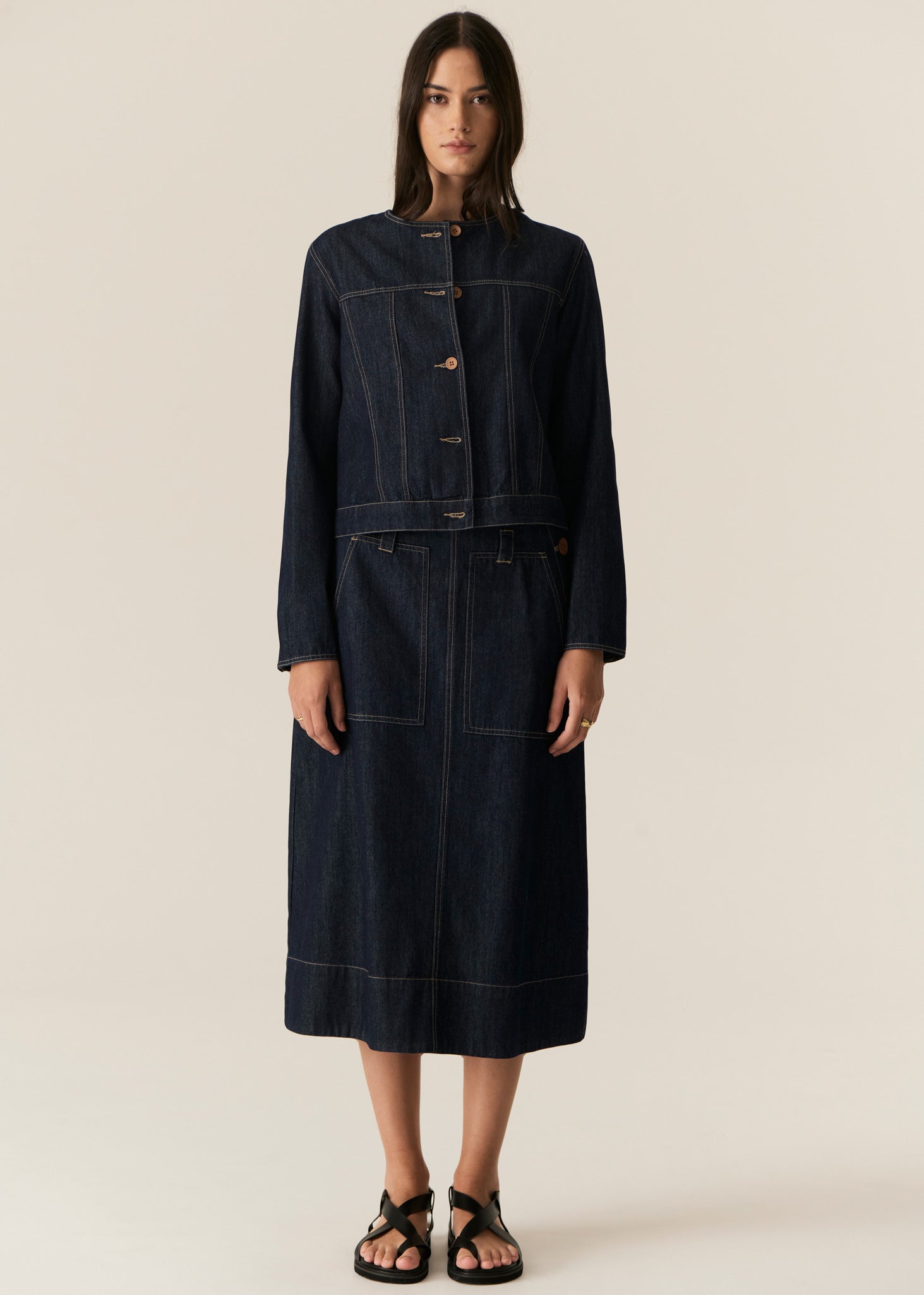 The Carsen Denim Jacket is an elevated take on a classic denim jacket. With refined topstitch detailing and a collarless design, we think this just may be the perfect layering piece for Spring.