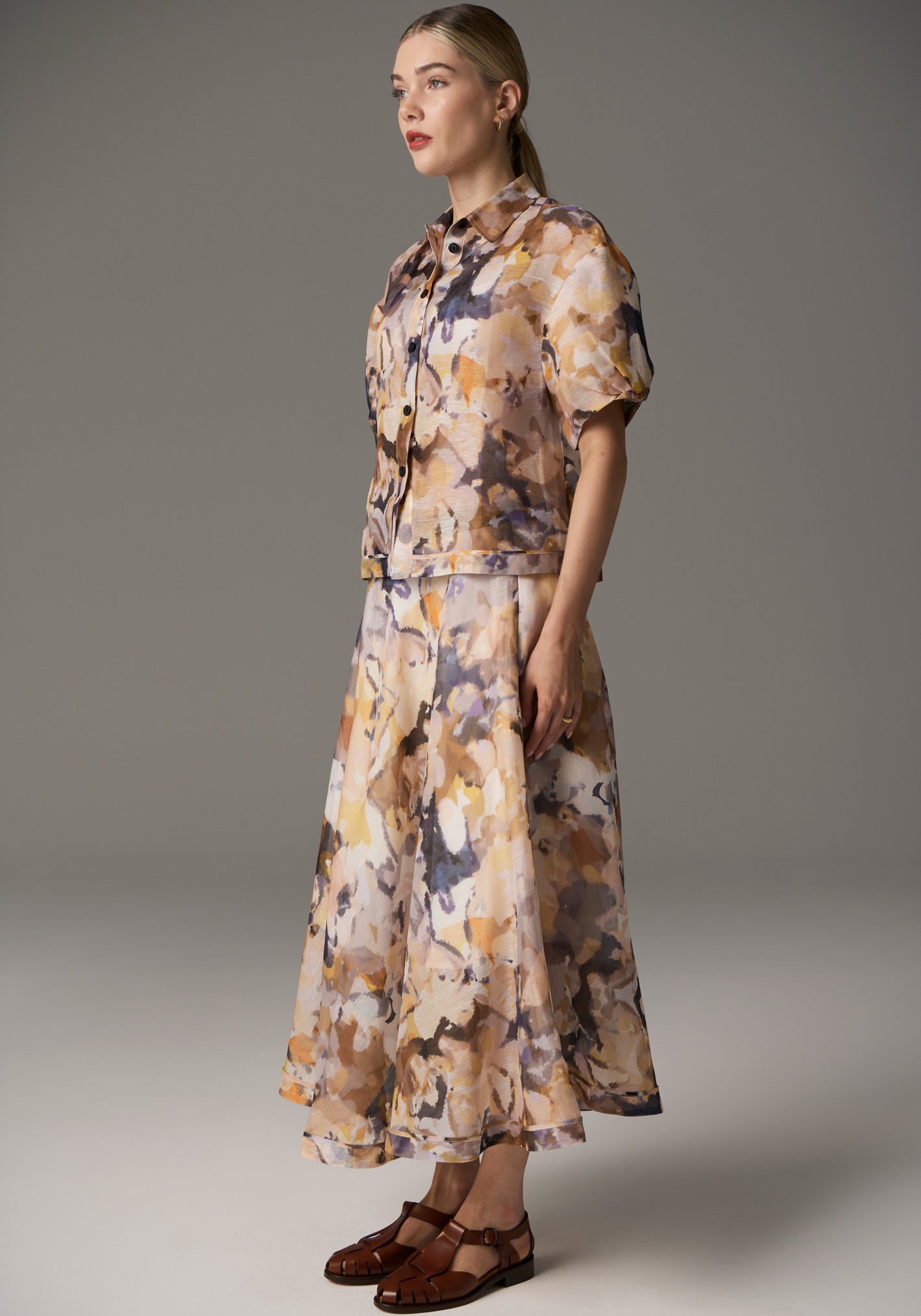 The Collage Camp Shirt features our gorgeous exclusive print in a structure silk linen Organdie.