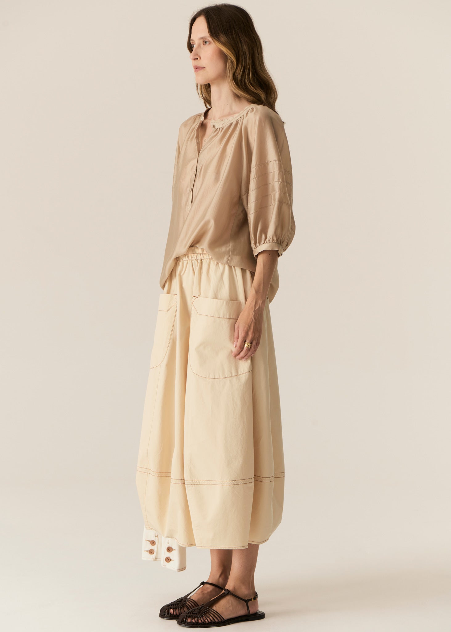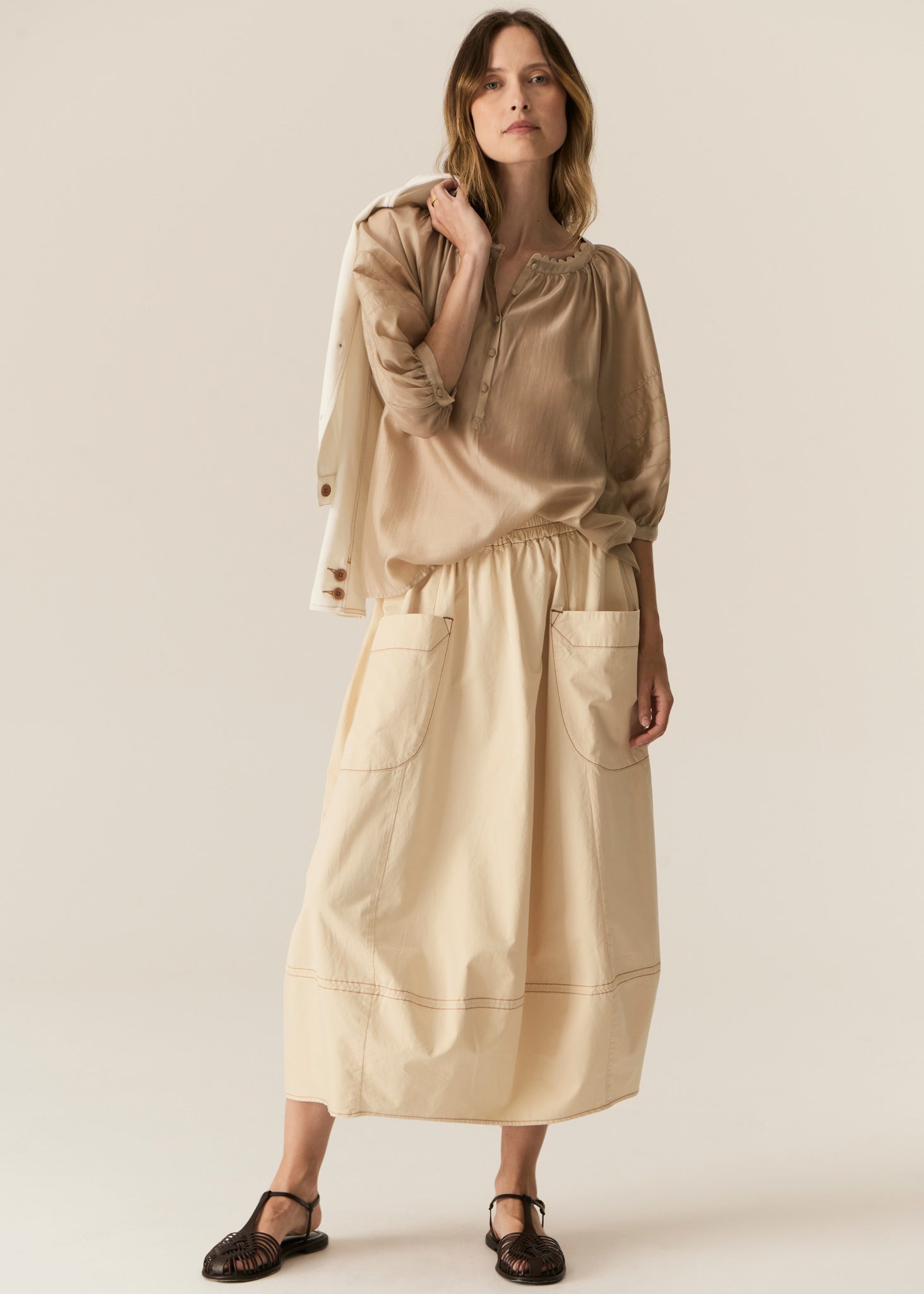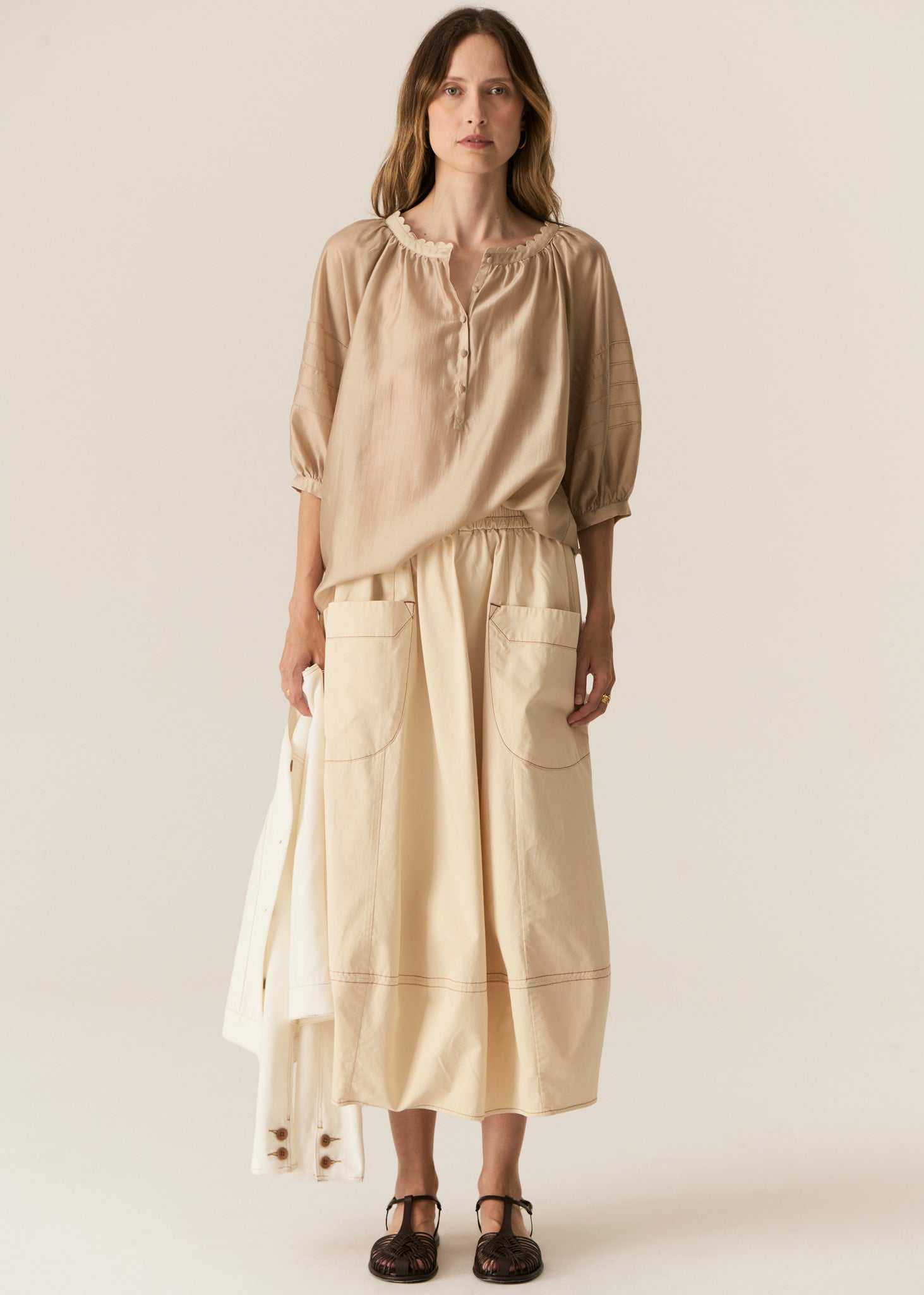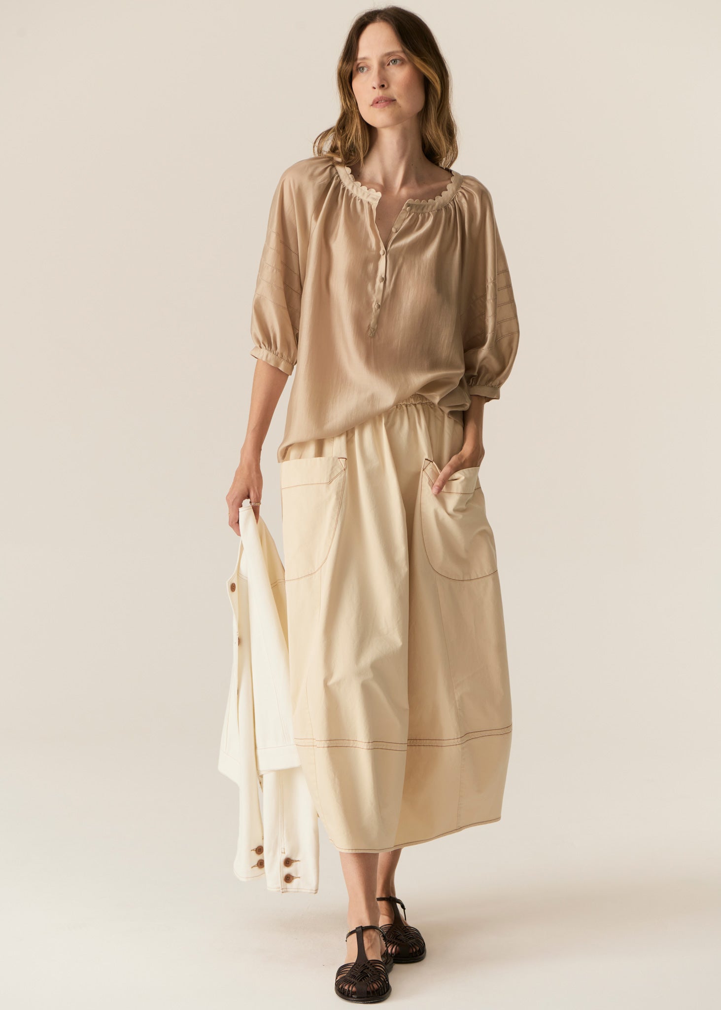 -Round neckline with scallop rick rack edge - tiny gathers under the neckline.