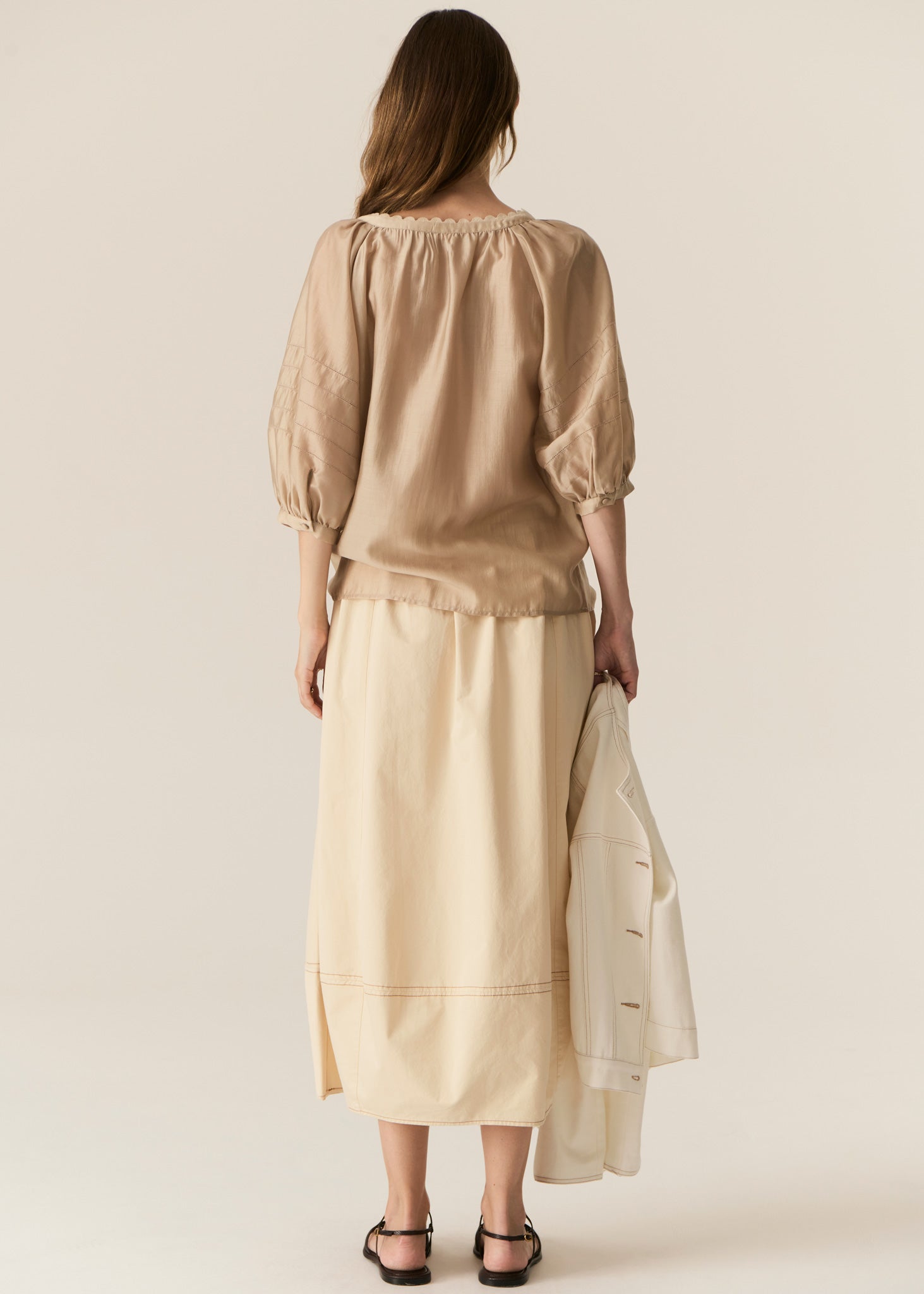 The Elea Top features femme detailing in a lightweight fabrication with a slight sheen.