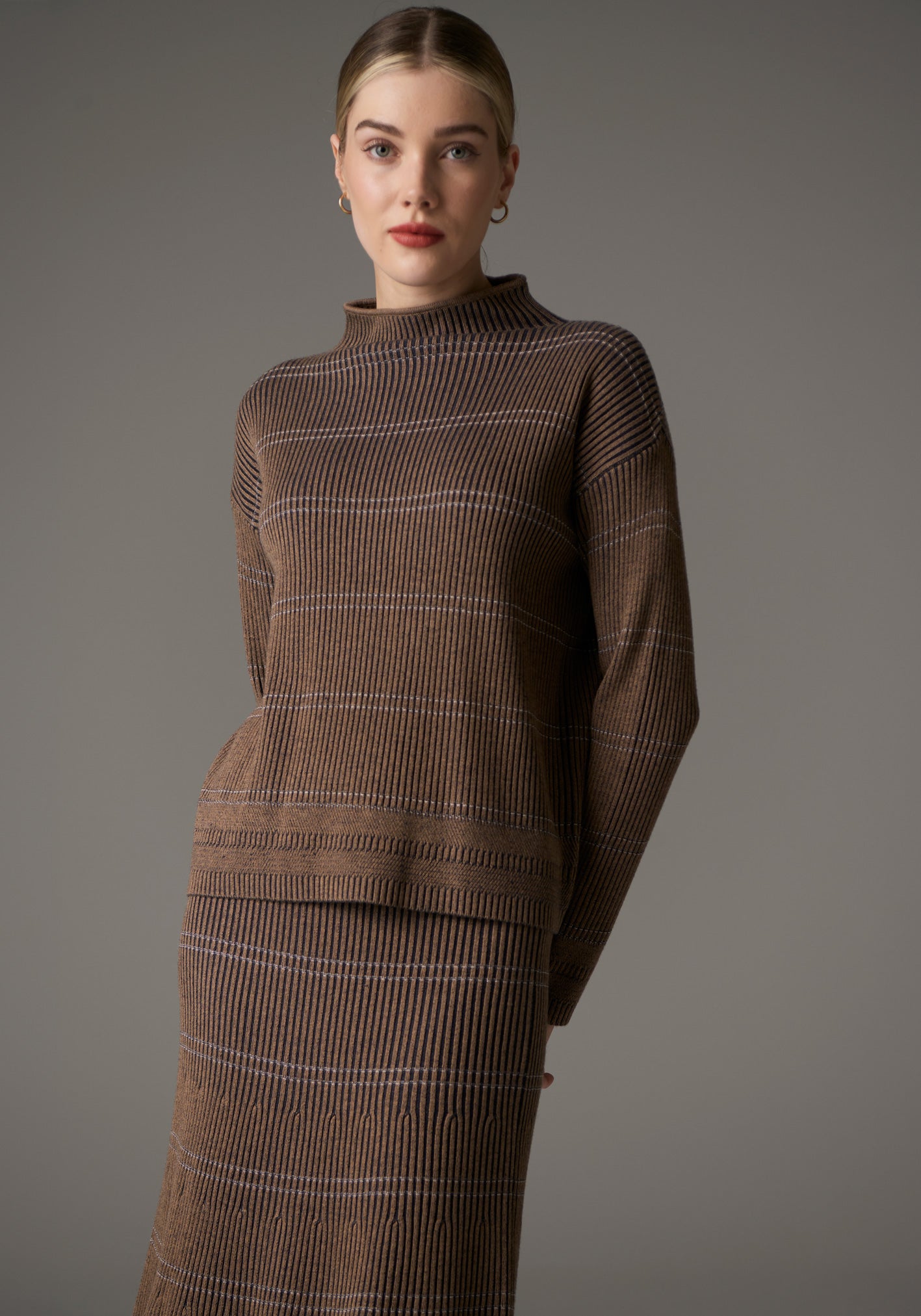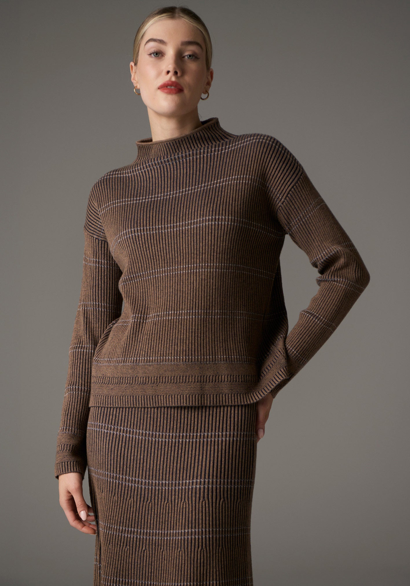 With a two tone rib detail and fine horizontal double stripes, the Lara Stripe Knit is an elevated Winter style.