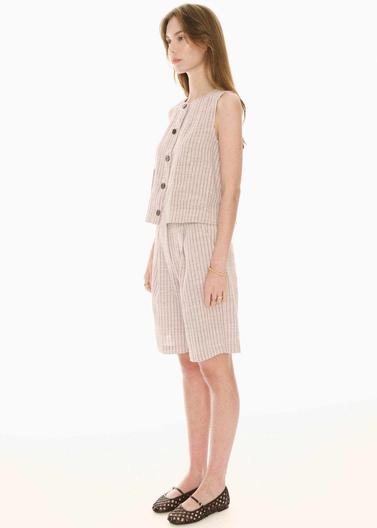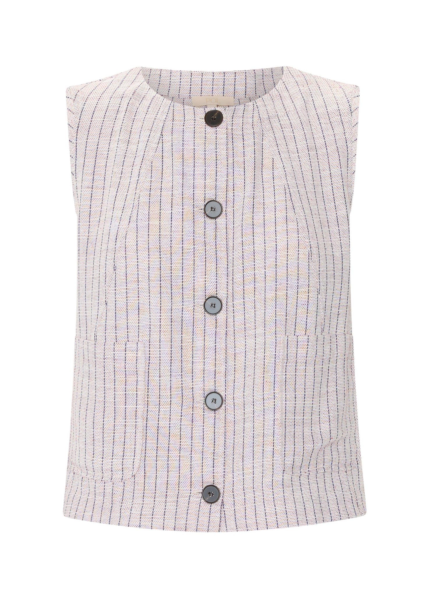 Made from a textured linen cotton blend with a contrast stripe, the Maya Vest is Summer suiting at its best.