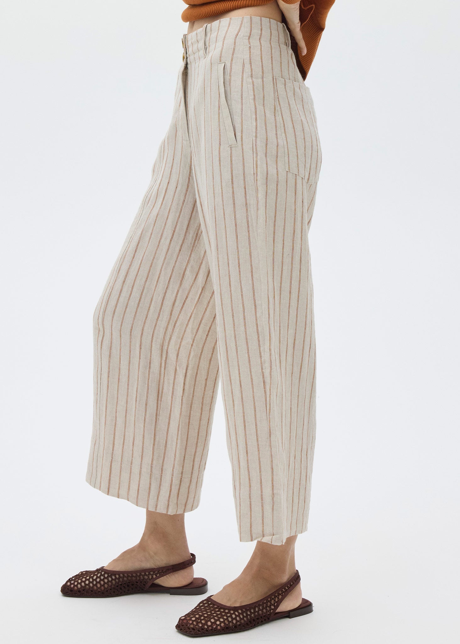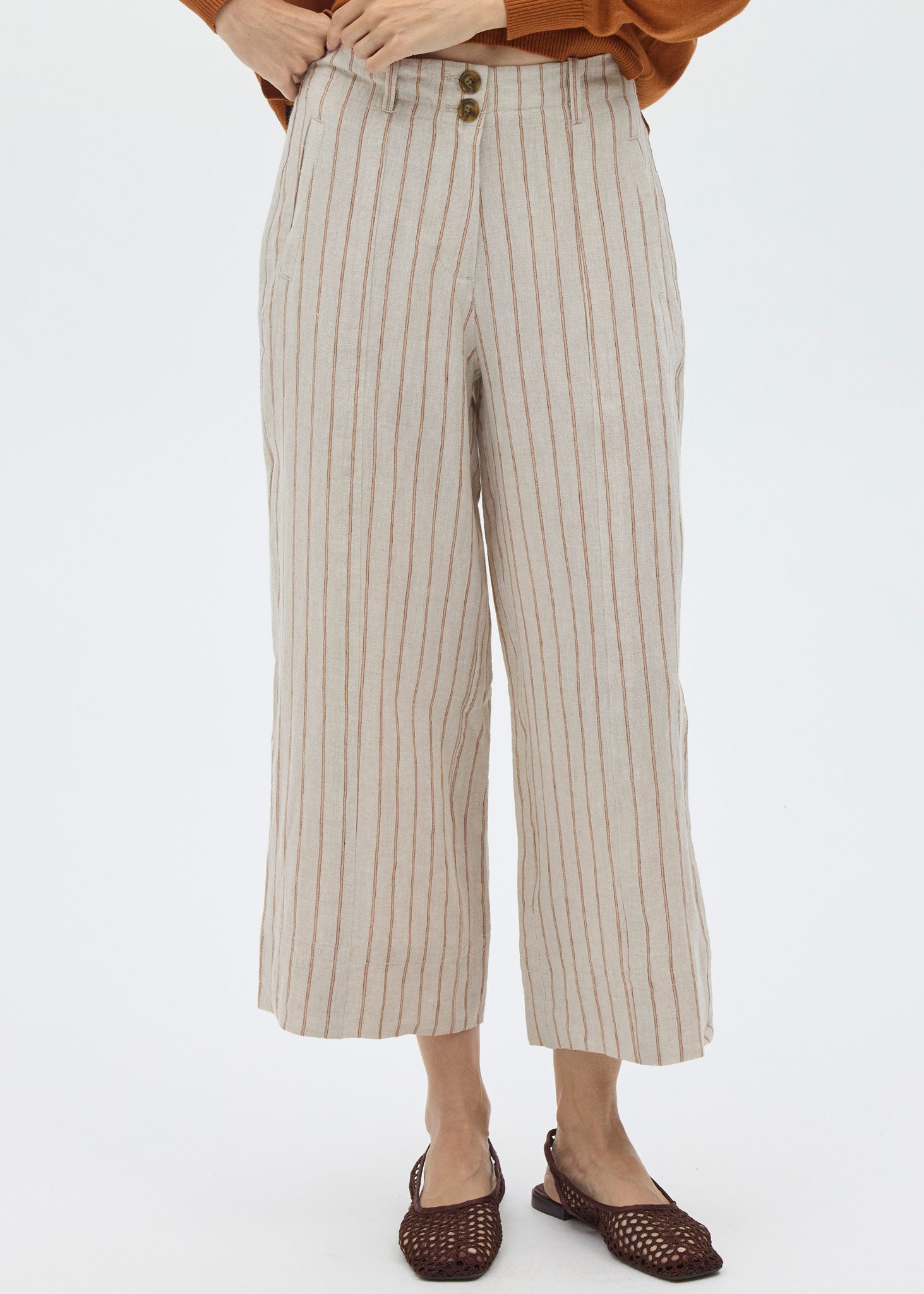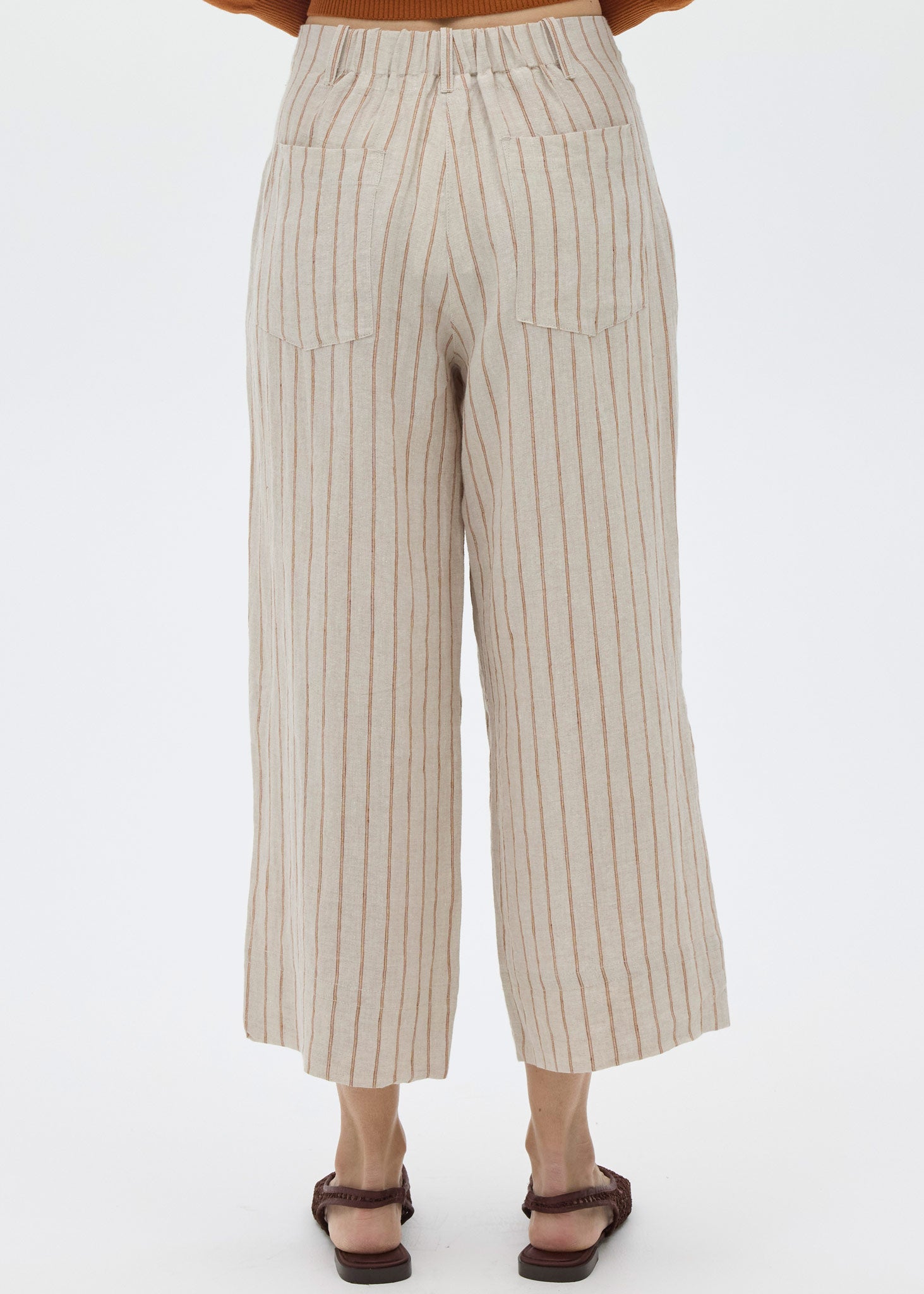 The Miley Linen Stripe Pant is our Raydel Denim Pant reimagined in a lightweight pinstripe linen. Made from deadstock fabric.