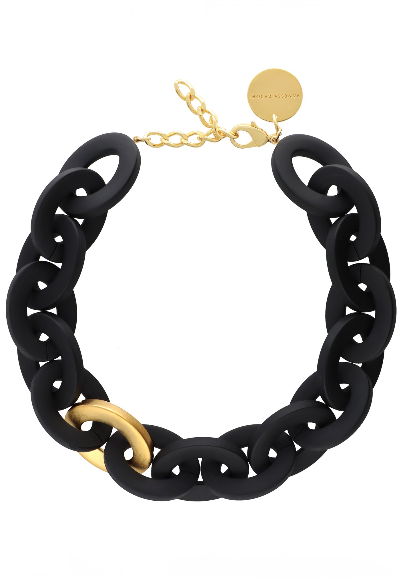 -Eye-catching acetate links gently hug the neck for feather-light comfort.