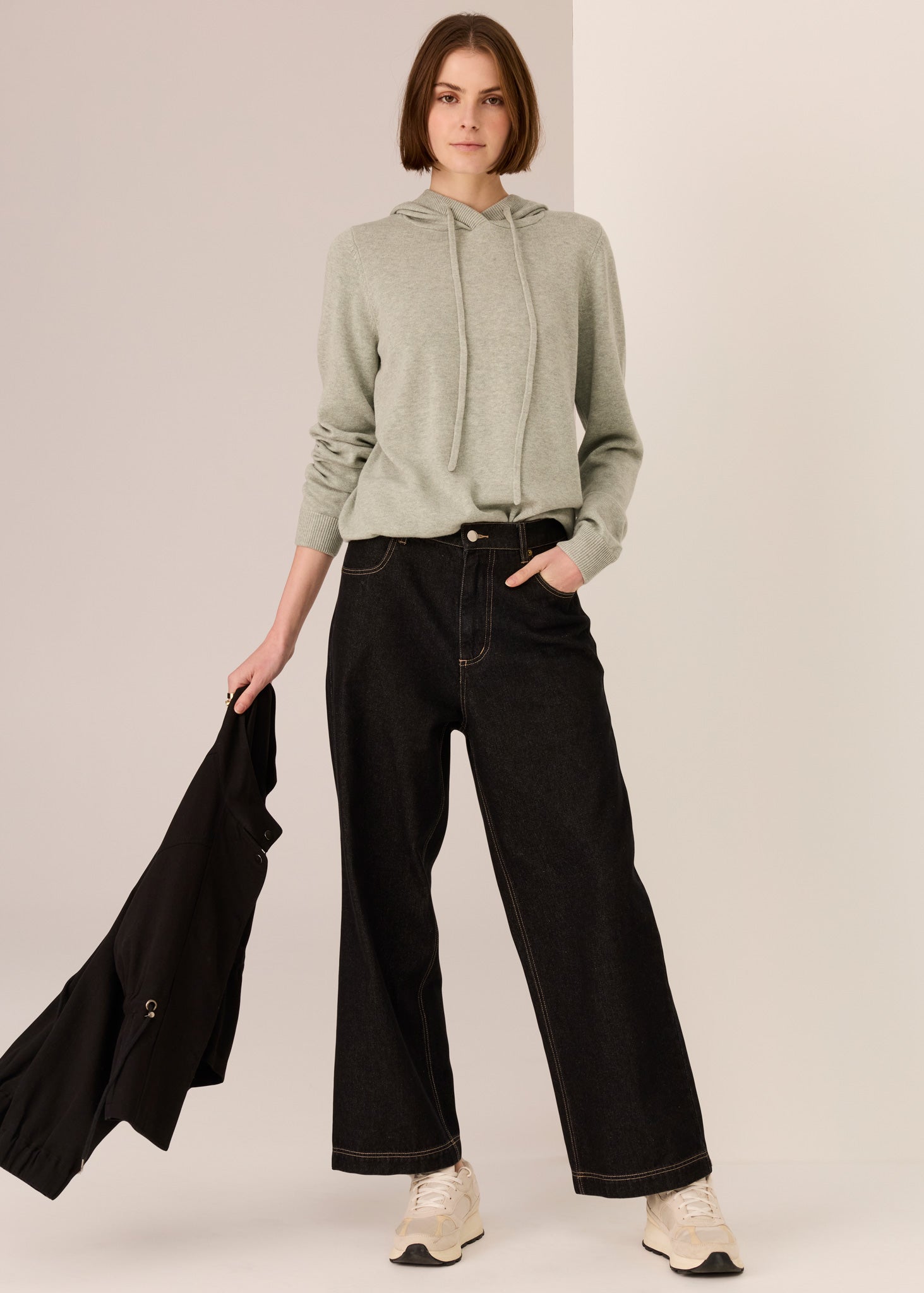 -Hooded neckline with ribbed edges and knitted drawcord.