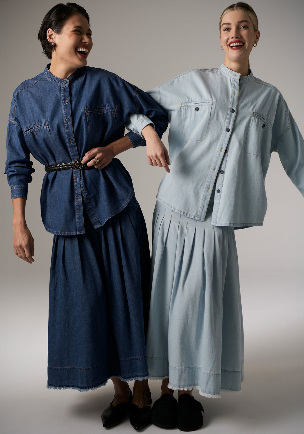 The Reece Denim Skirt features pleated detailing over the hips for a fit and flare silhouette that creates an elevated take on a wardrobe classic.