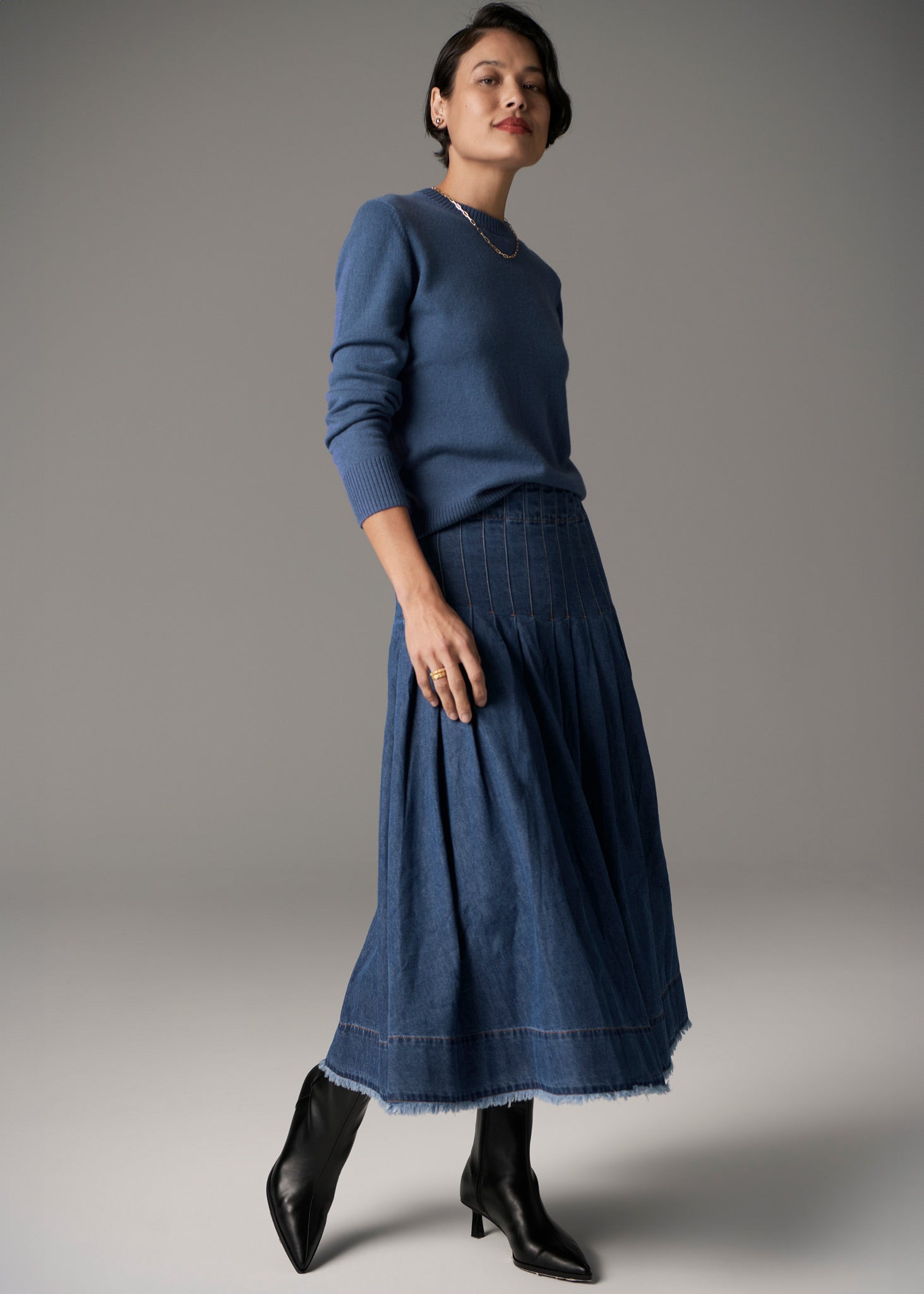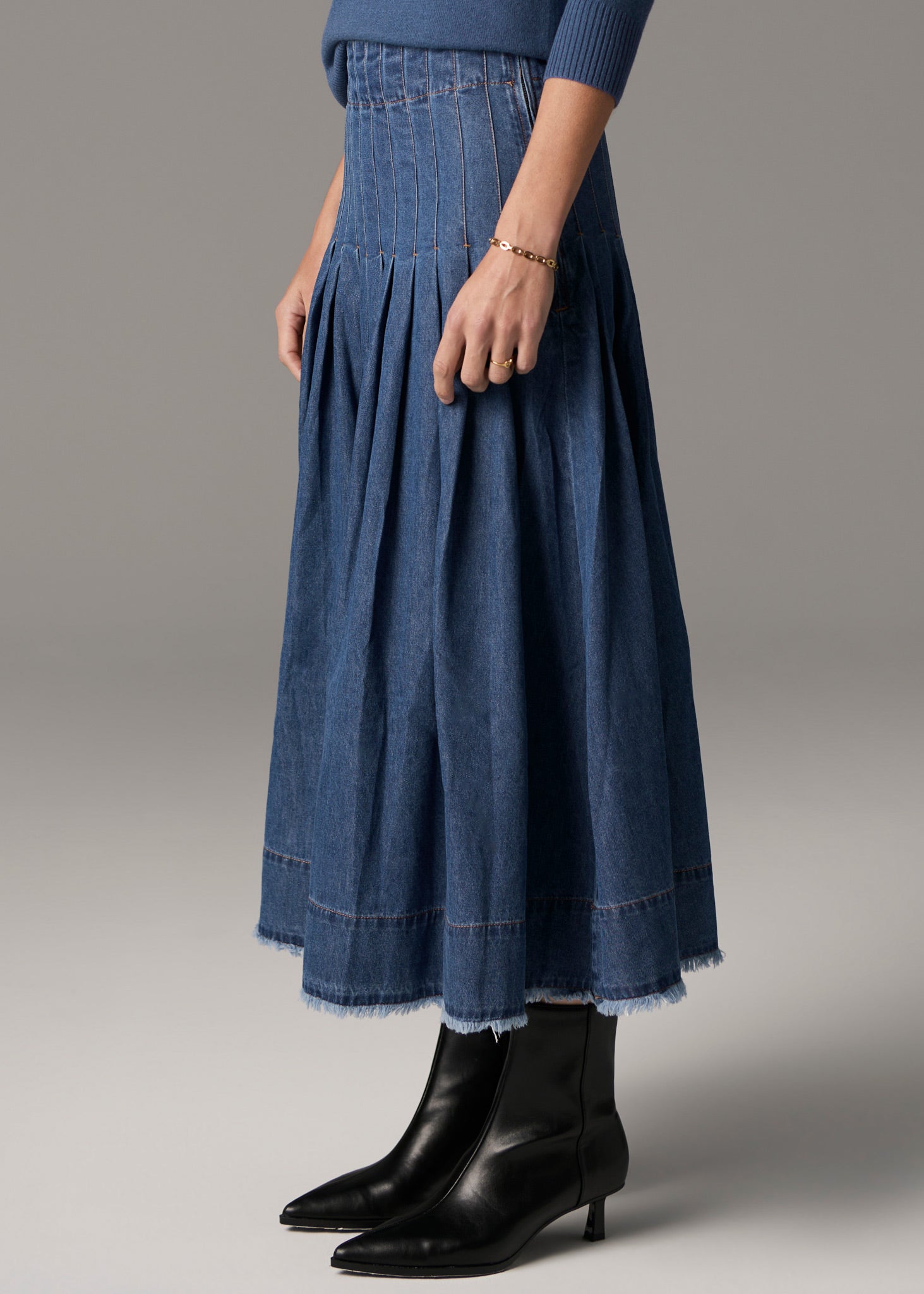 The Reece Denim Skirt features pleated detailing over the hips for a fit and flare silhouette that creates an elevated take on a wardrobe classic.