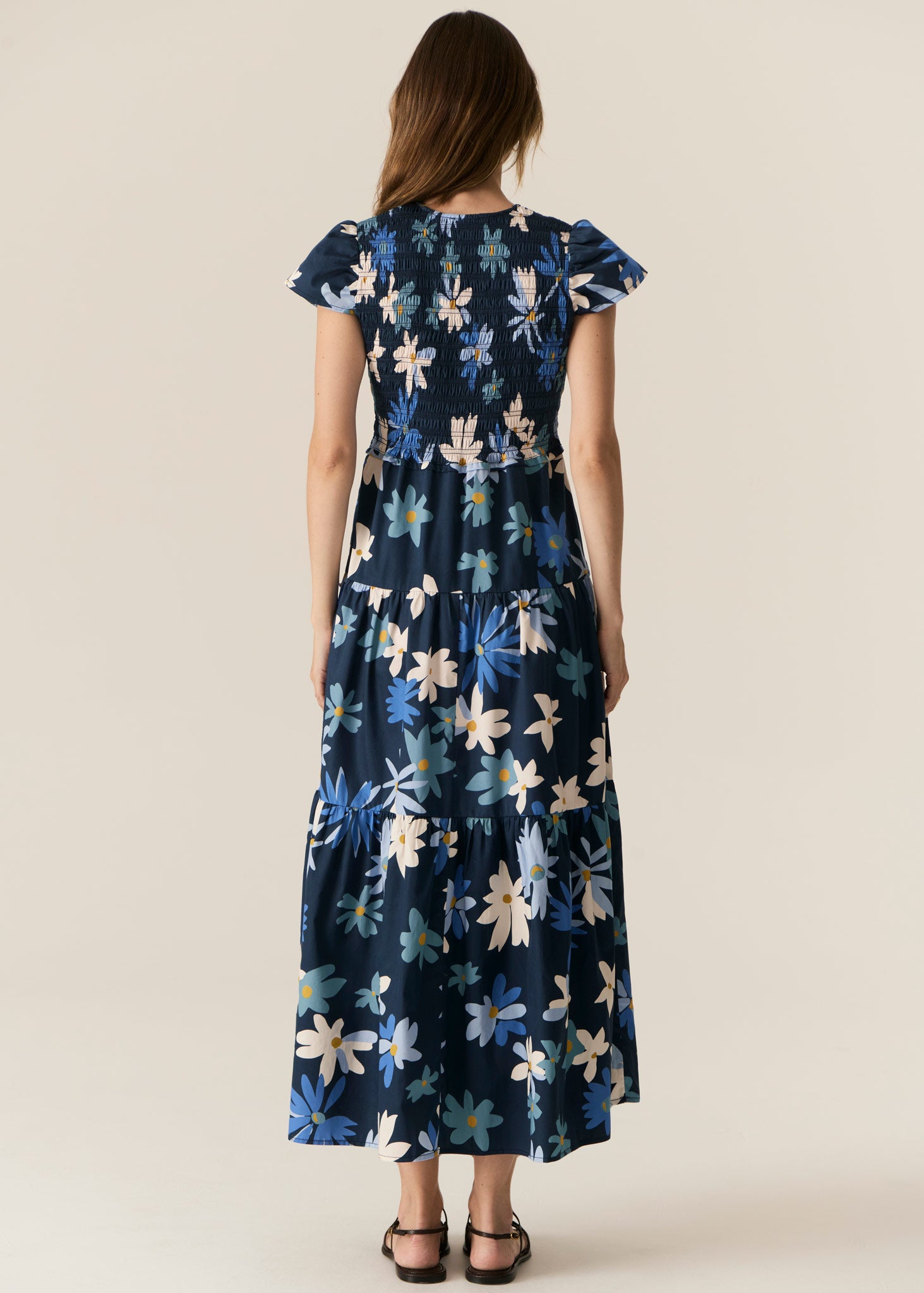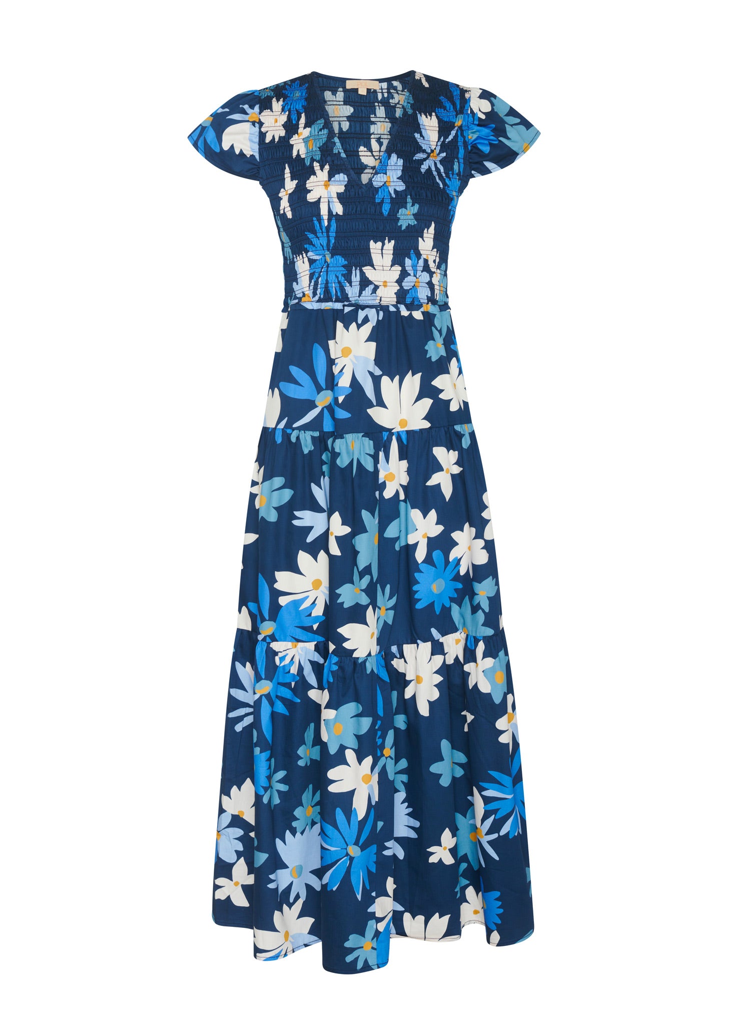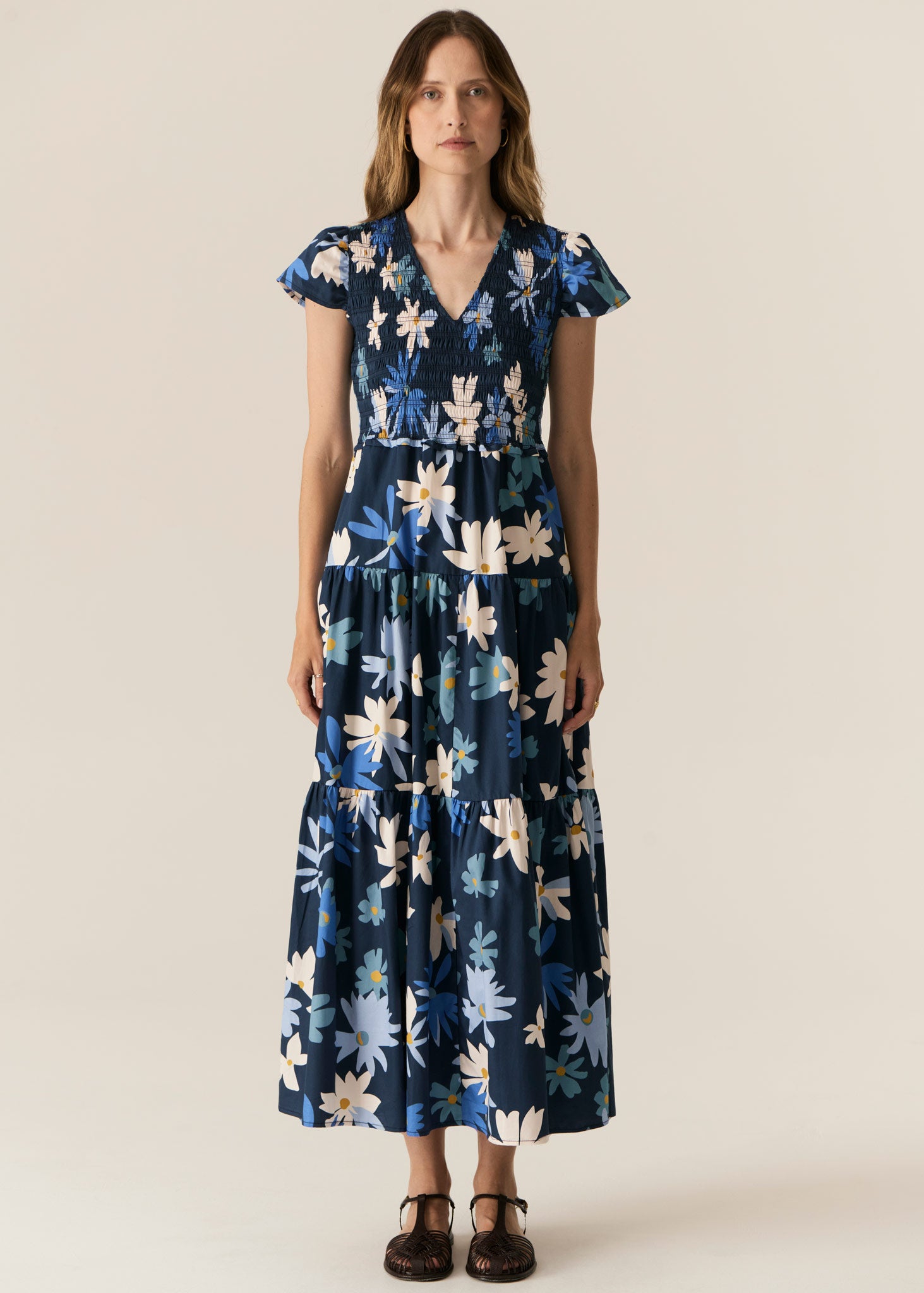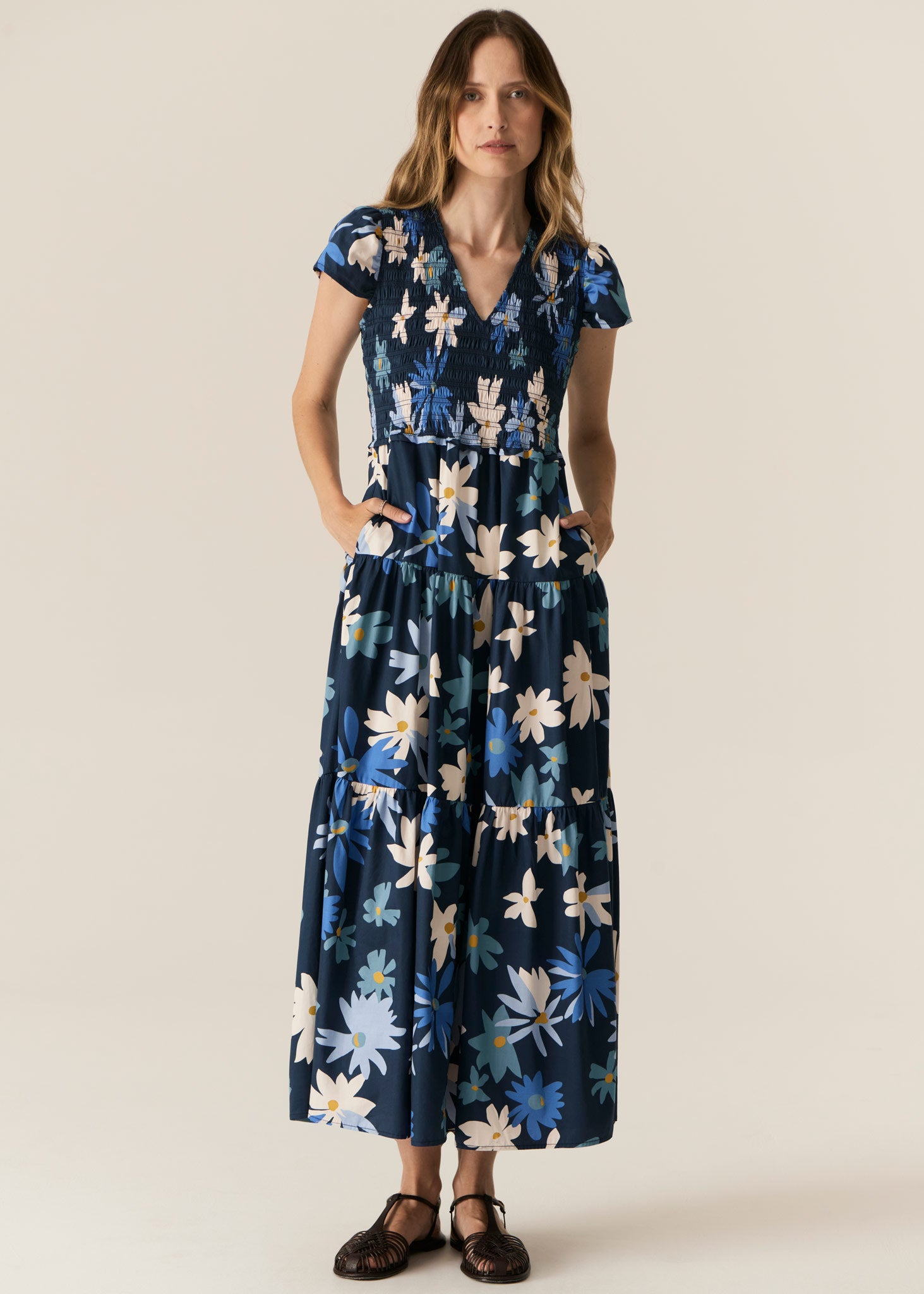 Featuring a shirred bodice for a fitted look without sacrificing comfort, the Savoy Shirred Dress features a gorgeous exclusive print floral print on a Navy base.